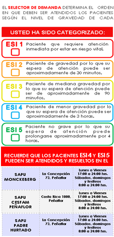 En el Servicio de Urgencia no se atiende por orden de llegada, sino que se prioriza la atención de los pacientes más graves y luego se atiende a los pacientes menos complejos. El nivel de gravedad lo determina el selector de demanda (ESI), donde personal de Enfermería evalúa el nivel de gravedad del paciente y lo determina según la categorización correspondiente, que va desde lo más grave (ESI 1 y ESI 2) hasta pacientes de menor complejidad (ESI 3, ESI 4, ESI 5).